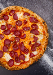 Salsa de tomates, queso mantecoso, salame ahumado y orégano